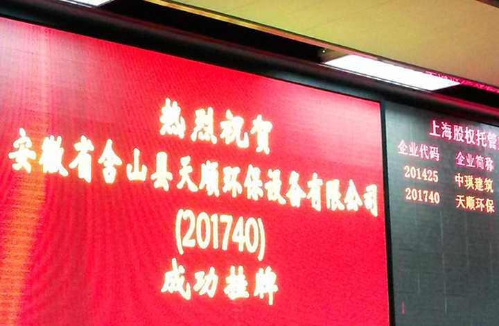 2014年9月26日,經(jīng)上海朗榮投資管理有限公司引薦, 成功推薦安徽省含山縣天順環(huán)保設(shè)備有限公司(企業(yè)代碼:201740)登陸上海股權(quán)托管交易中心股權(quán)報價系統(tǒng),順利邁出與資本市場對接的第步。