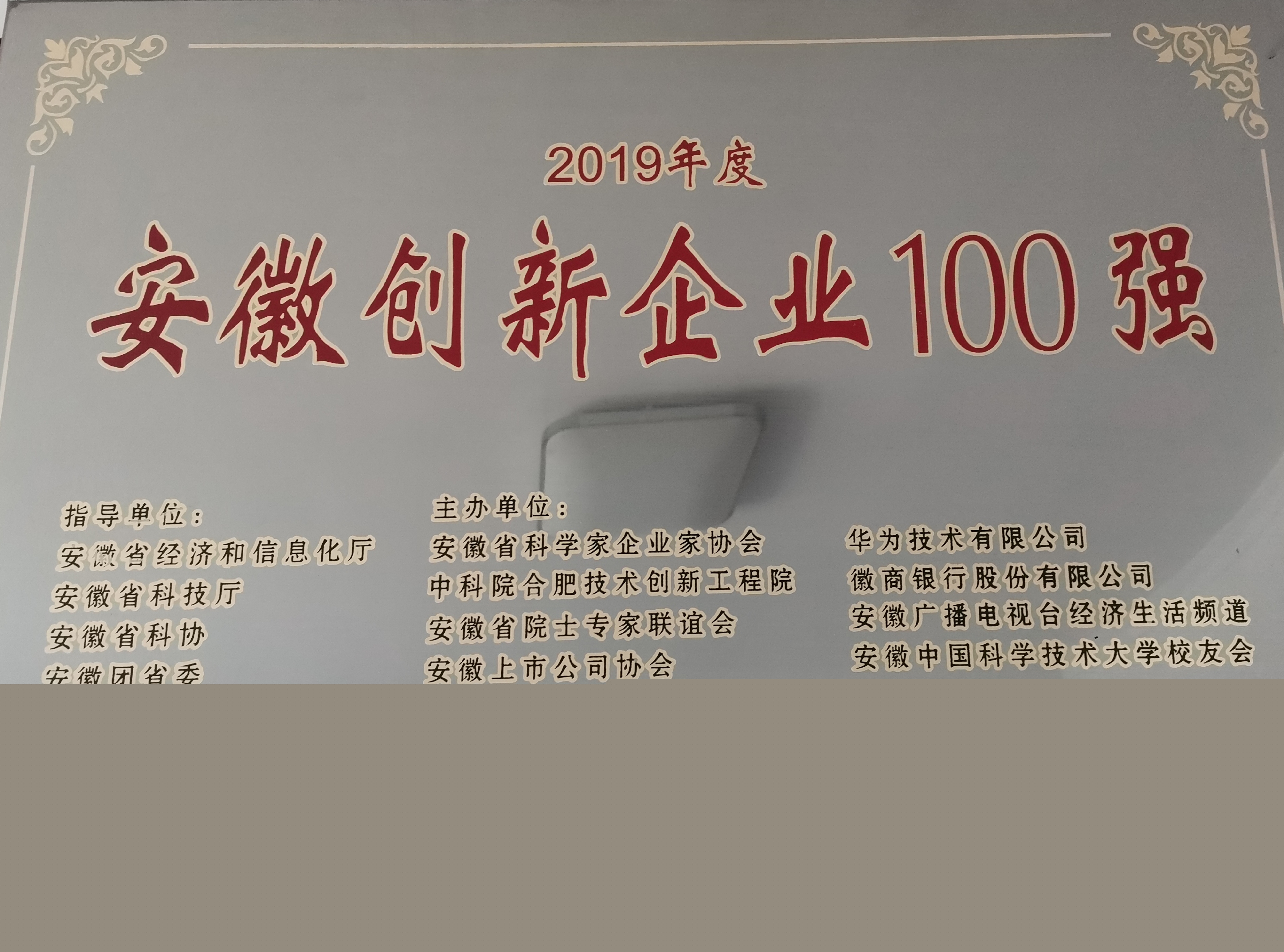 我公司2018年、2019年兩次榮獲“安徽創(chuàng)新企業(yè)100強(qiáng)”榮譽(yù)稱(chēng)號(hào)。
